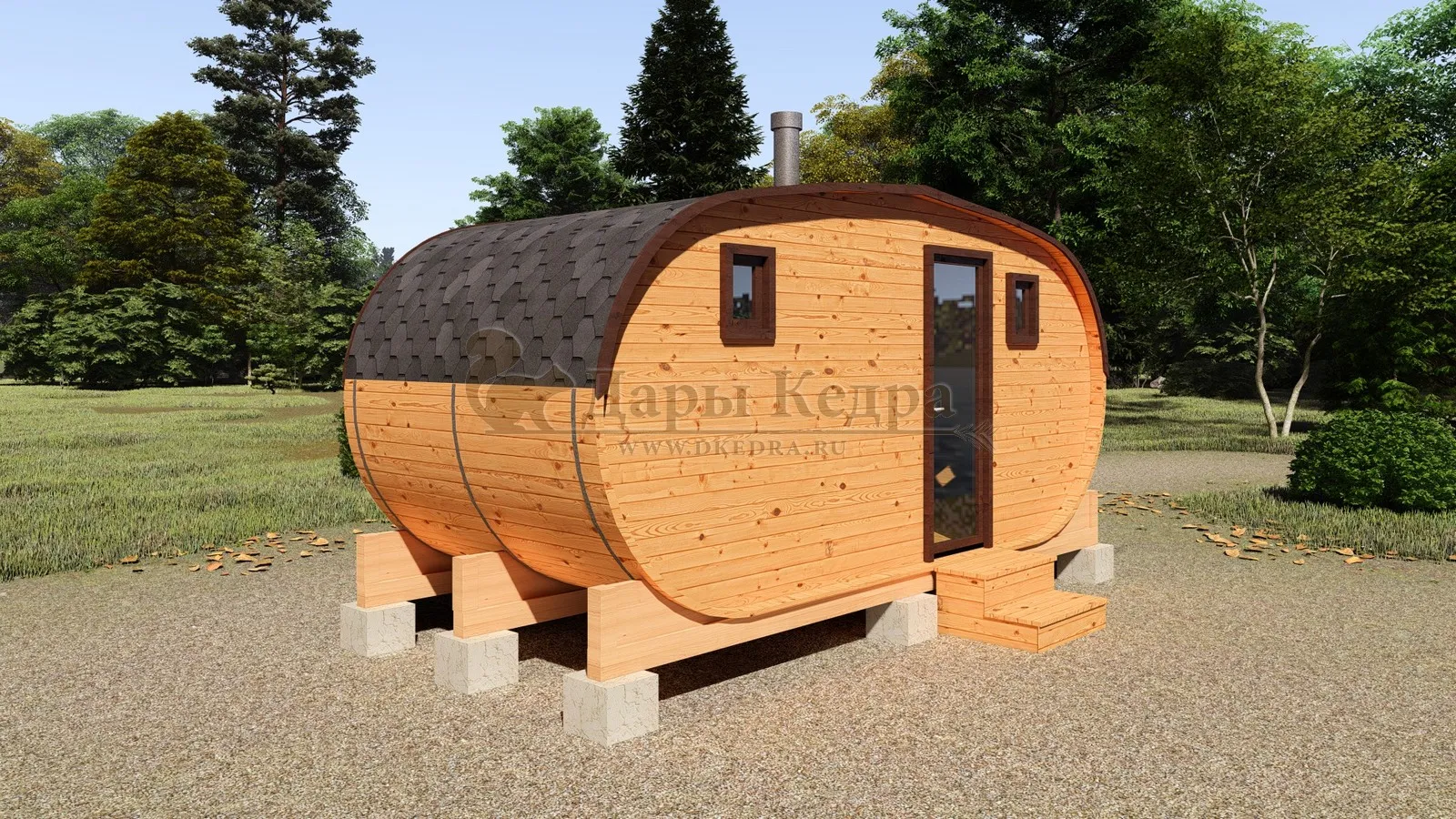Баня-бочка круглая из кедра 3 метра Это изделие круглой вытянутой формы с двумя отделениями: раздевалкой и парной. Лавочки из кедра находятся по всей длине бани-бочки с обеих сторон. Печь расположена в парилке около дальней стены. Для удобства пользования в раздевалке установлена вешалка и полочка из кедра. За счет небольшой конструкции баня нагревается не более 30 минут. По вашему желанию баню-бочку можно дополнить печью с внешней загрузкой, благодаря которой весь мусор после топки останется на улице. Круглая баня-бочка не требует полноценный фундамент, поэтому при необходимости ее можно перенести в другое место. Обращаем Ваше внимание, что в стандартную комплектацию бани входят лавки в парной с обеих сторон. Дополнительно можно заказать полок открытого или закрытого типа! Кедр обладает ароматическими свойствами. Он не деформируется и влагоустойчив, при правильном уходе за деревом на нем не развиваются грибки и плесень.