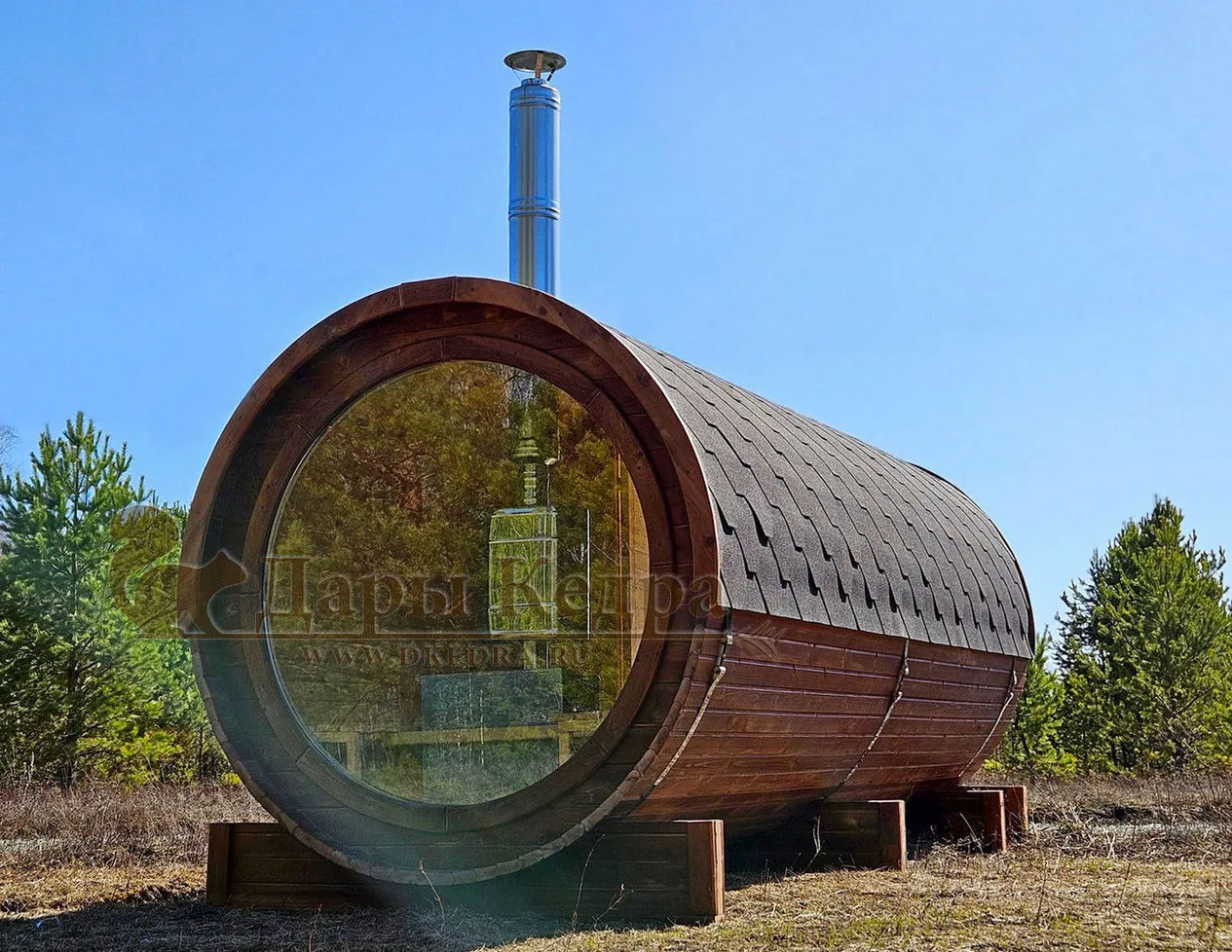 Баня-бочка «Орео» с боковым входом и панорамным окном Стильная и современная баня-бочка с боковым входом может быть выполнена длиною от 4 метров, что-бы было два отделения (парилка и комната отдыха). Полок может быть, как с двух сторон, так и угловой, в стандарте одноуровневый. Печь в данной модели расположена сбоку с топкой наружу, либо внутрь парилки. Печь можно укомплектовать баком для воды, а саму баню сделать длиною до 6 метров, комфортно разместив в ней дополнительно помывочную. В эту модель включено два закаленных стеклопакета: круглое и полукруг, которые мы можем разместить на ваше усмотрение в парилке и комнате отдыха. Обращаем Ваше внимание, по умолчанию в данной модели отсутствует бак для воды, вместо него идёт утеплённая термо-труба, которую можно заменить на бак по желанию.