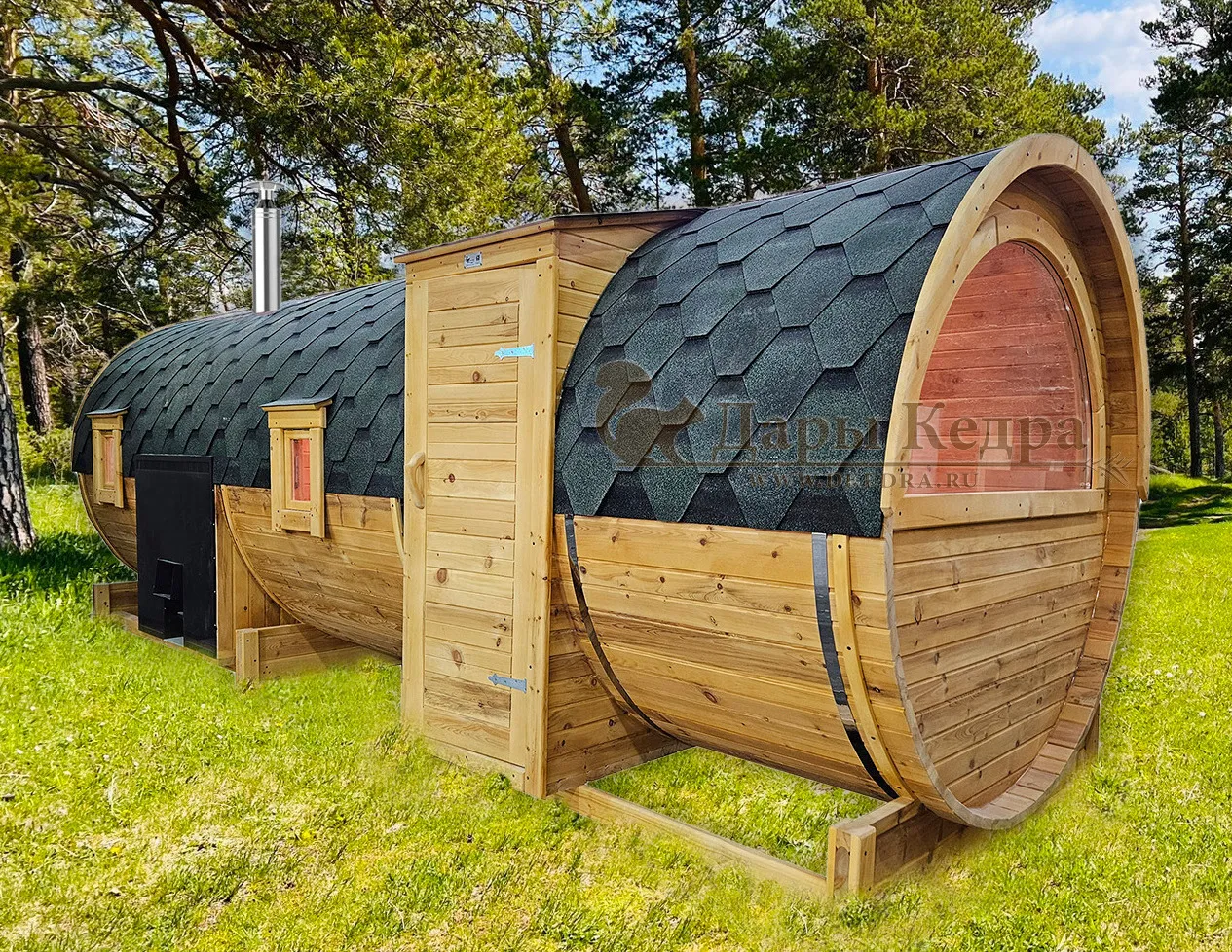 Баня-бочка буханка из кедра 4 метра Это более просторная модель за счет увеличенной высоты потолков и ровного пола. В такой модели раздевалка совмещена с моечной. Тут установлен душевой поддон, вешалка, полочка и лавочка из кедра. В парильном отделении по обе стороны расположены двухуровневые открытые полки, печь находится между ними у дальней стены. Время растопки такой бани не превышает 30 минут. По вашему желанию баню-бочку можно укомплектовать козырьком, верандой и печью с внешней загрузкой, благодаря которой весь мусор во время топки остается на улице. Баня-бочка буханка не требует полноценный фундамент, поэтому при необходимости ее можно перенести в другое место. Обращаем Ваше внимание, что в стандартную комплектацию бани входят полки открытого типа в парной с обеих сторон. Дополнительно можно заказать полок закрытого типа или лавку! Кедр обладает ароматическими свойствами. Он не деформируется и влагоустойчив, при правильном уходе за деревом на нем не развиваются грибки и плесень.