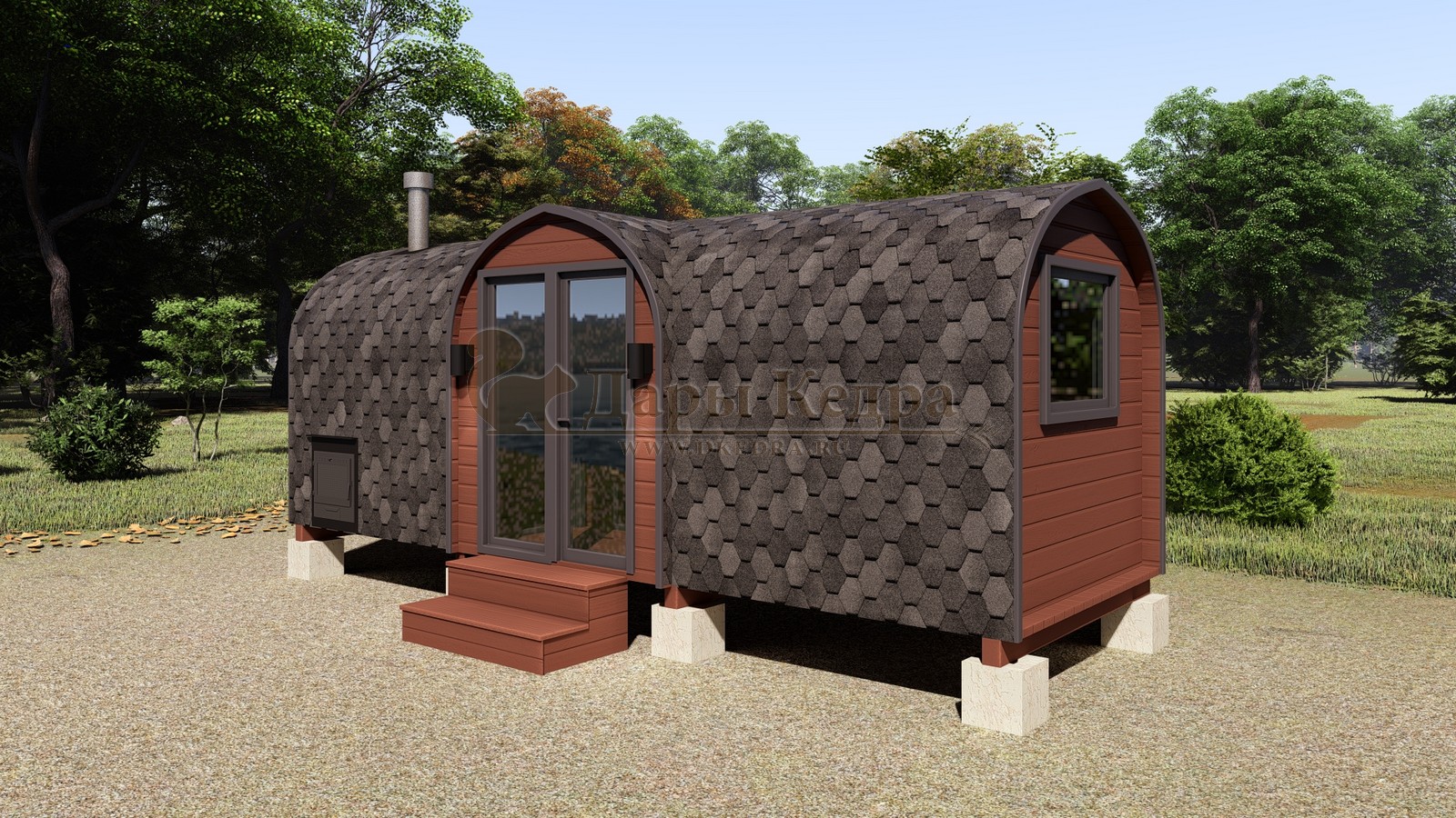 Симбиоз круглой и квадратной бани-бочки. Разработано с учётом эргономики, в ней так же просторно, как и в квадро-бочке, но при этом полукруглая крыша не дает задерживаться снегу и влаге на кровле. А еще такая баня безусловно красивая, мобильная и доступная каждому!