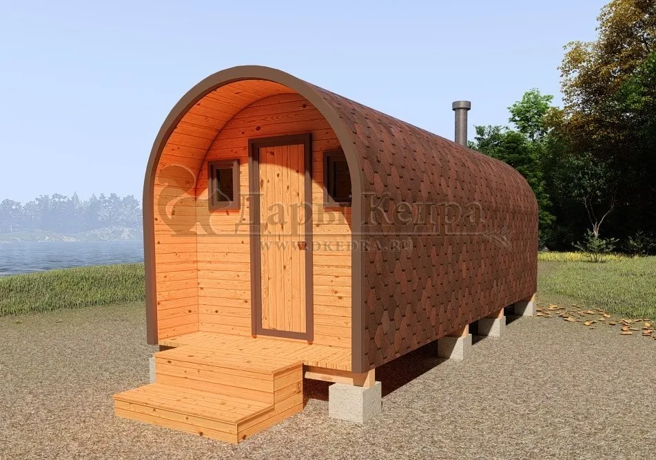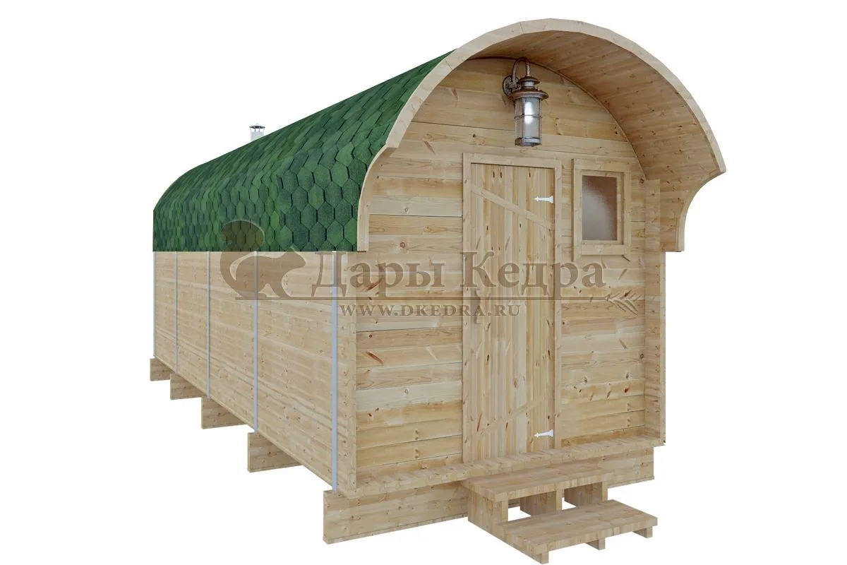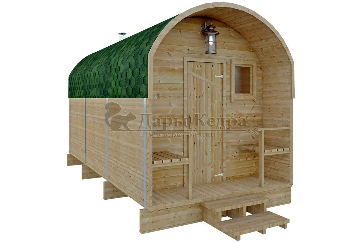 • Баня-бочка буханка из кедра с козырьком (все размеры) Баня-буханка более просторная за счет увеличенной высоты потолков и ровного пола. Козырек не только украшает баню, но и защищает оставленную обувь от дождя. Лавочки из кедра находятся по всей длине бани-бочки с обеих сторон. Печь расположена в парилке около дальней стены. Время растопки такой бани не превышает 30 минут. В зависимости от выбранного размера баня-бочка буханка с козырьком имеет следующую комплектацию: Баня-бочка буханка 2,5 метра - парилка; Баня-бочка буханка 3,5 и 4,5 метра - раздевалка, парилка; Баня-бочка буханка 5,5 метров - раздевалка, парилка, моечная. По вашему желанию ее можно укомплектовать печью с внешней загрузкой, благодаря которой весь мусор вовремя топки остается на улице. Баня-бочка буханка не требует полноценный фундамент, поэтому при необходимости ее можно перенести в другое место. Обращаем Ваше внимание, что в стандартную комплектацию бани входят полки открытого типа в парной с обеих сторон. Дополнительно можно заказать полок закрытого типа или лавку! Кедр обладает ароматическими свойствами. Он не деформируется и влагоустойчив, при правильном уходе за деревом на нем не развиваются грибки и плесень.