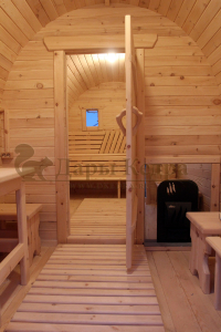 Это более просторная модель за счет увеличенной высоты потолков и ровного пола. В такой модели раздевалка совмещена с моечной. Тут установлен душевой поддон, вешалка, полочка и лавочка из кедра. В парильном отделении по обе стороны расположены двухуровневые открытые полки, печь находится между ними у дальней стены. Время растопки такой бани не превышает 30 минут. По вашему желанию баню-бочку можно укомплектовать козырьком, верандой и печью с внешней загрузкой, благодаря которой весь мусор во время топки остается на улице. Баня-бочка буханка не требует полноценный фундамент, поэтому при необходимости ее можно перенести в другое место.