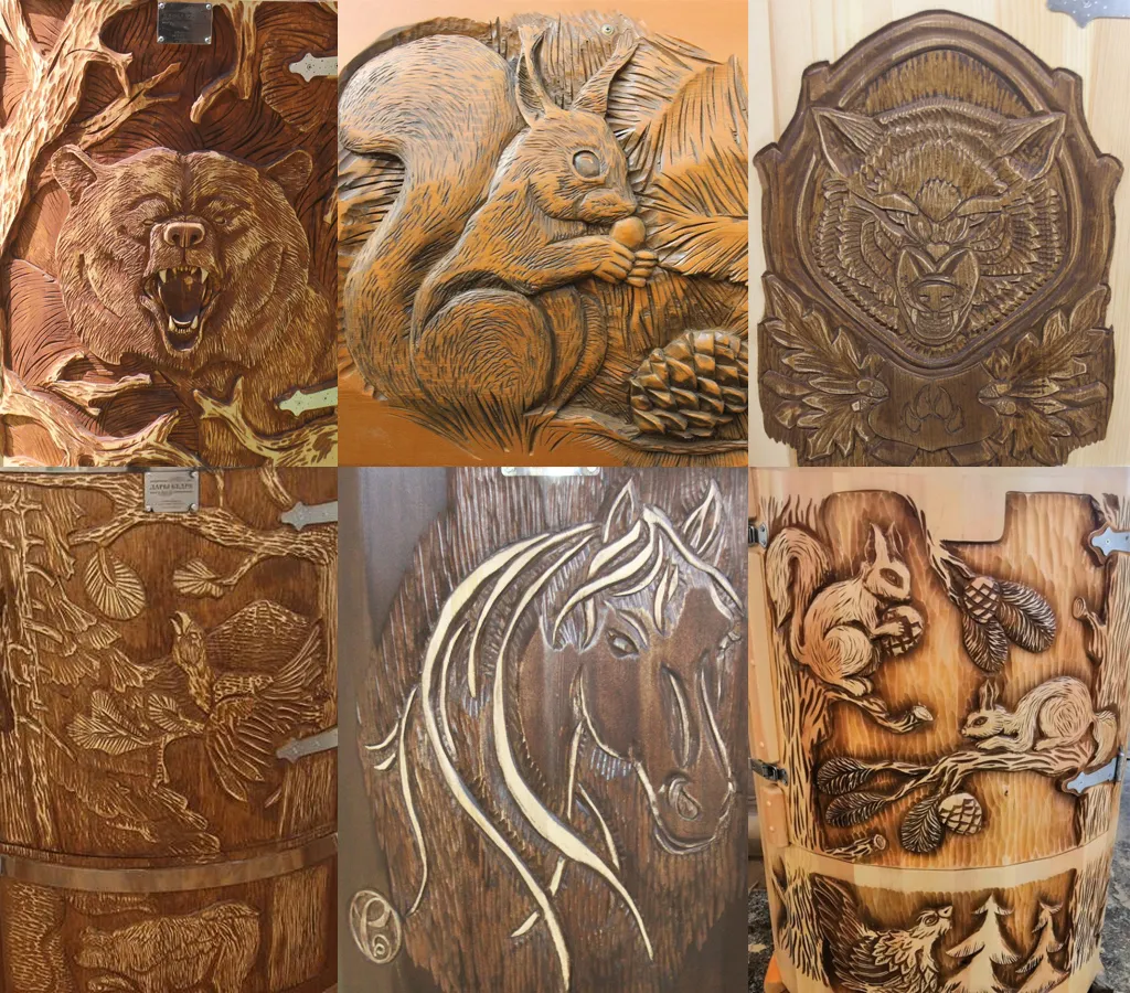 Художественная резьба это ручная работа, выполняется разными мастерами и каждый рисунок неповторим. Вы можете выбрать предложенные варианты резьбы или подобрать изображение и мы предложим вам подходящий эскиз. На сайте представлены наши работы в качестве примера. Каждая резьба рассчитывается индивидуально и может быть нанесена на любую модель фитобочки.