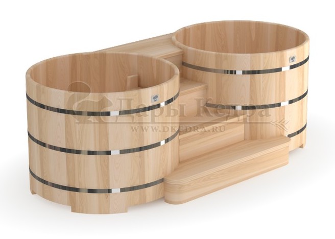 Двойная овальная купель для бани из кедра Двойная купель из кедра чаще всего используется в крупных банных комплексах и оздоровительных центрах. Она представляет собой две овальные чаши для воды, в которых люди отдыхают после парения. Между купелями установлен широкий подиум из кедра, по которому могут спускаться и подниматься сразу несколько людей. Для комфортного отдыха купель оснащена лавочками и двумя дополнительными лестницами. Обручи из нержавеющей стали декорируют изделие и равномерно распределяют нагрузку воды во время пользования. При правильном уходе купель для бани не рассыхается и не подвергается гниению. При взаимодействии древесины кедра с водой активируются эфирные масла и фитонциды, благодаря чему организм насыщается полезными веществами.