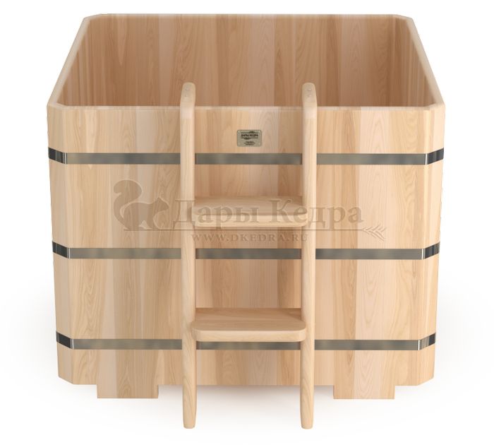 Квадратная купель для бани из кедра Это квадратная емкость для воды из кедра. Она предназначена для отдыха и охлаждения тела после банных процедур. Благодаря своей форме купель хорошо впишется в угол помещения, так же ее можно установить на улице. Квадратная купель оснащена лавочками, приставной и внутренней лестницей из кедра. За счет стяжных болтов обручи из нержавеющей стали плотно прилегают к кедровой купели. Это позволяет равномерно распределять нагрузку воды и сохранить форму изделия в период эксплуатации. При правильном уходе купель для бани не рассыхается и не подвергается гниению. Обязательно обращайте внимание на ширину дверных проёмов. Если они не позволяют занести изделие в собранном виде, то рекомендуем заказать разборную модель купели, которая оплачивается отдельно. При взаимодействии древесины кедра с водой активируются эфирные масла и фитонциды, благодаря чему организм насыщается полезными веществами.