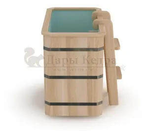 Это емкость для воды с прямоугольной пластиковой чашей. Купель предназначена для отдыха и охлаждения тела после процедур парения. Подходит для уличного и комнатного использования. Для удобства пользования овальная купель с пластиковой вставкой оснащена лавочками, приставной и внутренней лестницей из кедра.