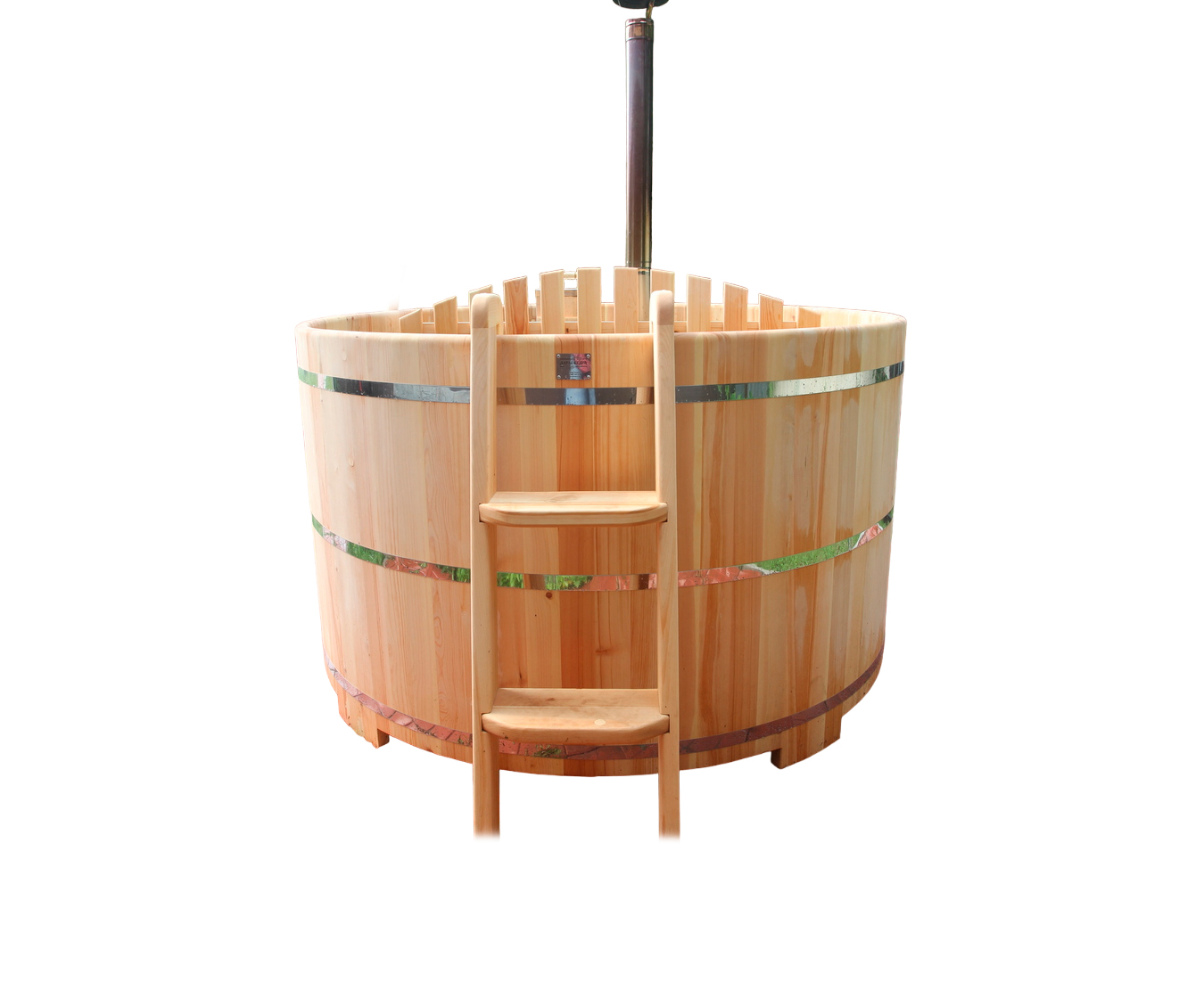 Фурако круглая из кедра с внешней печью Это уличная баня, которой можно пользоваться круглый год. Купель представляет собой круглую емкость для воды, внутри которой располагаются сиденья из кедра. Подогрев воды осуществляется приставной печью с дымоходом. Для удобства пользования японская баня фурако оборудована внешней и внутренней лестницей из кедра. Целебная древесина кедра богата фитонцидами и эфирными маслами, которые активируются при нагревании. Таким образом, во время процедур парения организм насыщается полезными веществами.