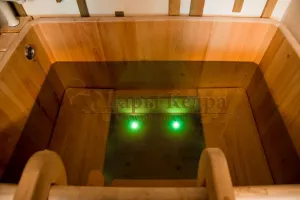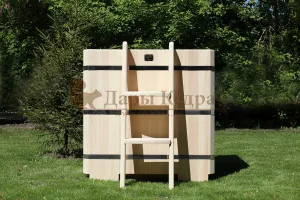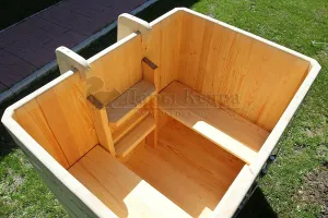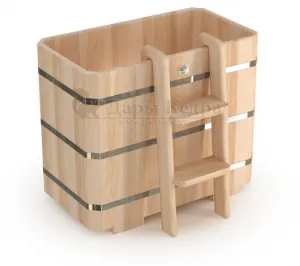 Представляет собой герметичную емкость для воды из кедра, которая предназначена для отдыха и охлаждения тела после процедур парения. Ширина прямоугольной купели равна ширине стандартных дверных проемов (78 см), поэтому занести в помещение ее можно в собранном виде. Благодаря прямоугольной форме купель хорошо впишется в угол помещения. Так же ее можно установить на улице. Прямоугольная купель оснащена лавочками, приставной и внутренней лестницей из кедра. Обручи из нержавеющей стали плотно прилегают к изделию, что позволяет равномерно распределить нагрузку воды и сохранить форму во время эксплуатации. При правильном уходе купель для бани не рассыхается и не подвергается гниению.