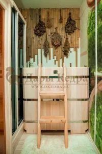 При взаимодействии древесины кедра с водой активируются эфирные масла и фитонциды, благодаря чему организм насыщается полезными веществами.