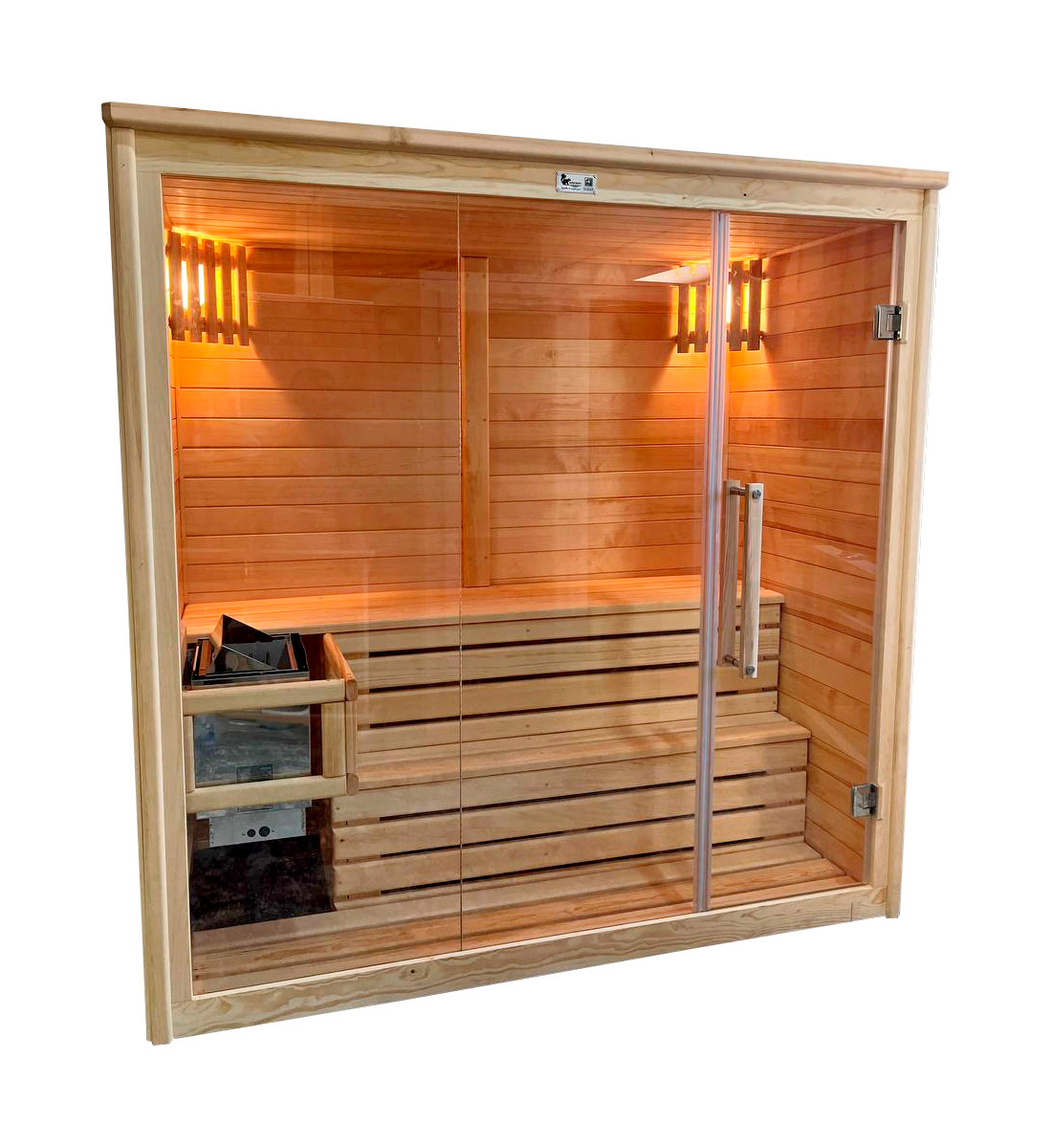 • Трехместная прямая финская «Элит» сауна кабина из кедра и липы с электрокаменкой Это специально оборудованная готовая деревянная кабина для сухого и влажного парения. Электропечь нагревает пространство внутри и позволяет сбрызгивать камни водой, слегка увлажняя воздух. Такая процедура позволяет избежать перегрева. Каркас сауны выполнен из массива кедра, снаружи и внутри обшит липовой вагонкой сорта «Экстра» и имеет теплоизоляционный слой. Также двухуровневый полок идёт из кедра для обогащения внутри кабины полезными фитонцидами, а в сочетании с противовирусными свойствами липы сауна становится настоящим источником здоровья. Закаленный цельностеклянный фасад с безрамной дверью является термостойким и придает конструкции легкость и обзорность. Можно добавить боковую стенку, как на образце 3D модели из термостекла за дополнительную плату. Дополнив кабину панелью из гималайской соли или можжевеловым панно с подсветкой вы получаете красивейший объект в интерьере. Финская сауна с электропечью подойдет, как для домашнего использования, так и для коммерции. Доставляется в разборном виде щитами, собирается по инструкции с помощью шуруповёрта.